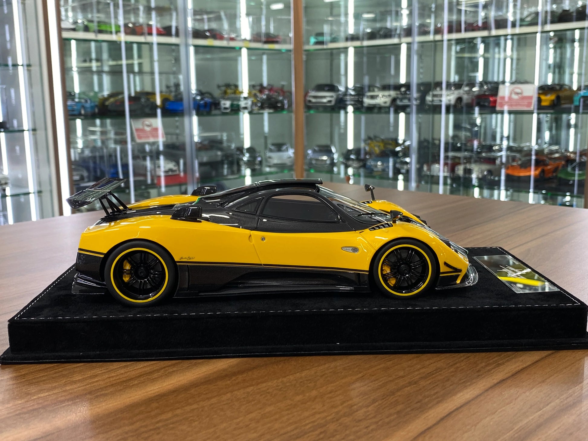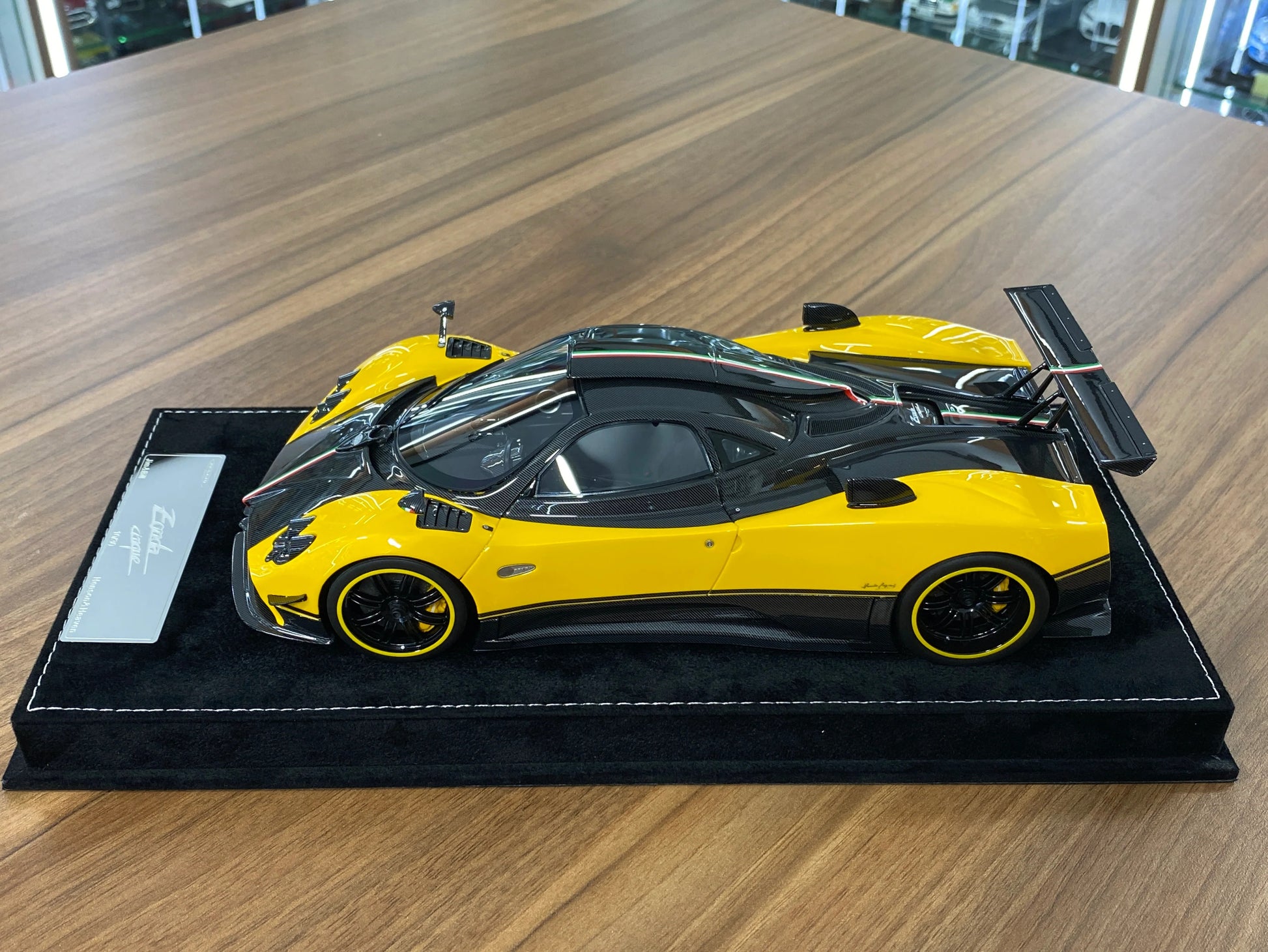 Presenting the exquisite 1:18 scale Pagani Zonda Cinque resin model by HH Model , finished in a striking Yellow with authentic Carbon Fiber detailing. This highly detailed, non-opening model is part of a limited edition run with only 30 pieces worldwide, making it an exclusive collectible for supercar aficionados.